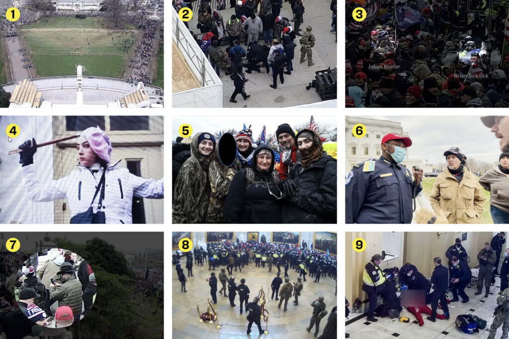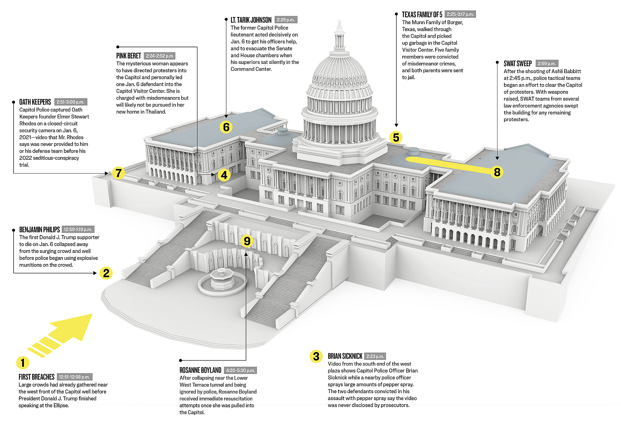 (1) Large crowds had already gathered near the west front of the U.S. Capitol well before President Donald J. Trump finished speaking at the Ellipse. (2) Benjamin Philips collapsed away from the surging crowd and well before police began using explosive munitions on the crowd. (3) Video from the south end of the west plaza shows Capitol Police officer Brian Sicknick and a police officer nearby spraying large amounts of pepper spray. The two defendants convicted of assaulting him with pepper spray say the video was never disclosed by prosecutors. (4) Pink Beret directed protesters into the Capitol and personally led one Jan. 6 defendant into the Capitol Visitor Center. (5) The Munn Family of Borger, Texas, walked through the Capitol and picked up garbage in the Capitol Visitor Center. Five family members were convicted of misdemeanor crimes. (6) Lt. Tarik Johnson (L) acted decisively on Jan. 6 to evacuate the Senate and House chambers while his superiors sat silently in the Command Center. (7) Capitol Police captured Oath Keepers founder Stewart Rhodes on a closed-circuit security camera on Jan. 6, 2021-video. (8) After the shooting of Ashli Babbitt at 2:45 p.m., police tactical teams began an aggressive effort to clear the Capitol of protesters. (9) After collapsing near the Lower West Terrace tunnel and being ignored by police, Rosanne Boyland received immediate resuscitation attempts once she was pulled into the Capitol.
