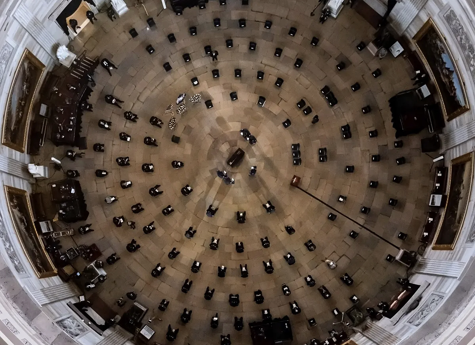 A funeral service is held for Capitol Police officer Brian Sicknick as his remains rest in honor in the Rotunda of the U.S. Capitol in Washington on Feb. 3, 2021. Kevin Dietsch/Pool/Getty Images