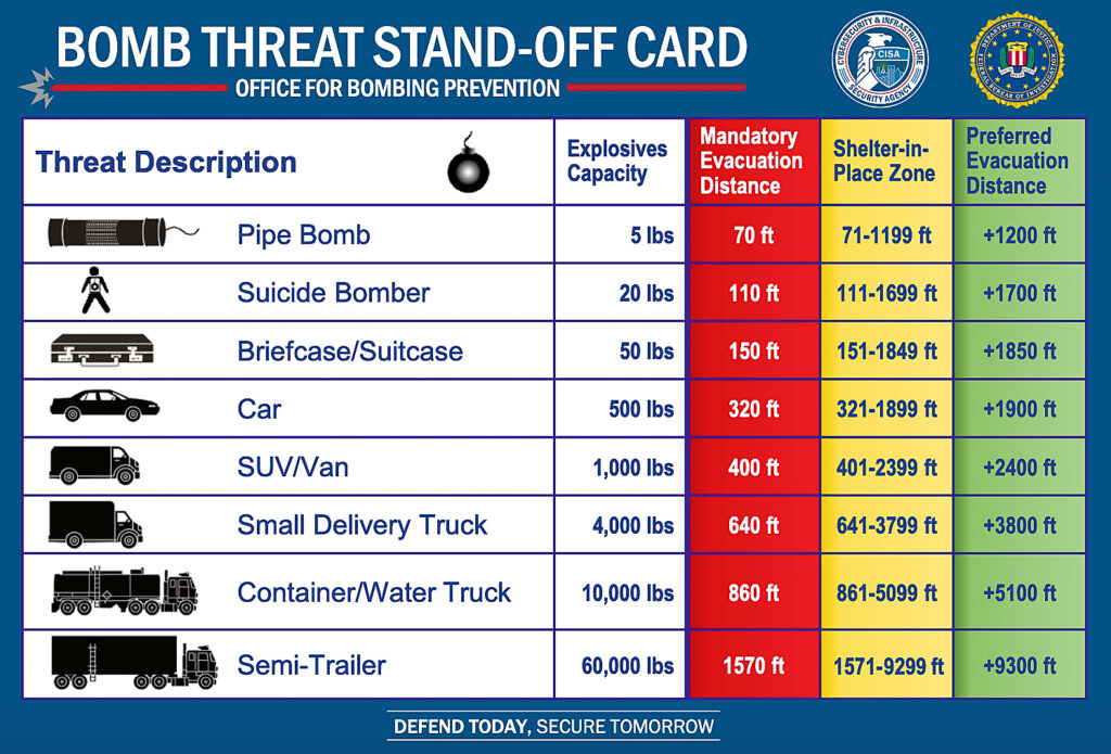 According to guidelines developed by the FBI, the Department of Justice, and the Department of Homeland Security, the minimum evacuation perimeter for a pipe bomb is 70 feet, while the preferred evacuation zone is at least 1,200 feet.