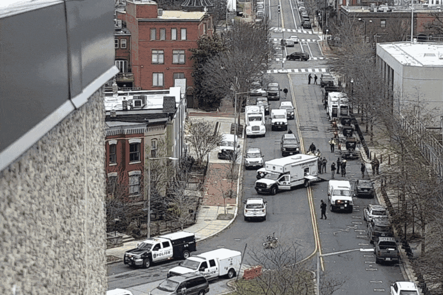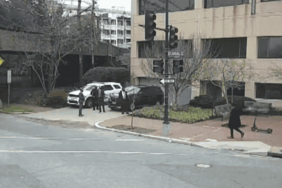 Just before 1:13 p.m., a blue passenger vehicle drove down Ivy Street Southeast, turned onto Canal, and sat at the stoplight adjacent to the DNC. Someone approached the driver and gestured before the vehicle drove off toward Washington Avenue Southwest.