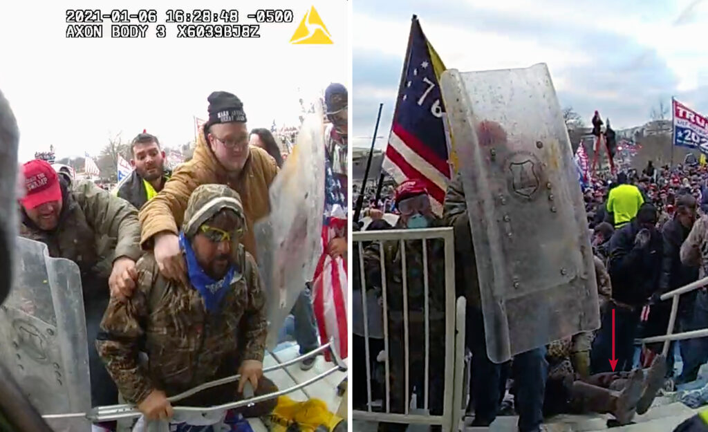 The only contact any police officer had with Boyland before she was pulled into the Capitol was Morris and the wooden walking stick she used to strike the unconscious Boyland in the head, face, and ribs, video showed.