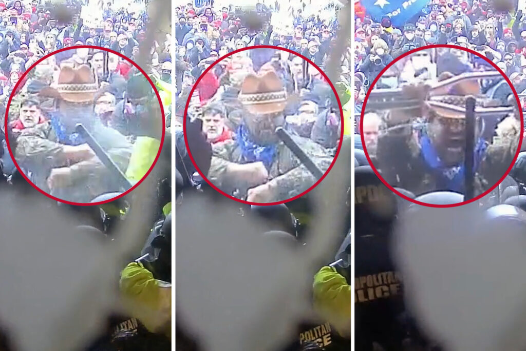 Texas filmmaker Luke Coffee took a direct blow to the left arm from Metropolitan Police Department Officer Lila Morris on Jan. 6, 2021, yet it was Coffee who was found guilty of assaulting the notorious D.C. officer who seconds later savagely beat Rosanne Boyland with a hardened walking stick, multiple videos viewed by Blaze News showed.