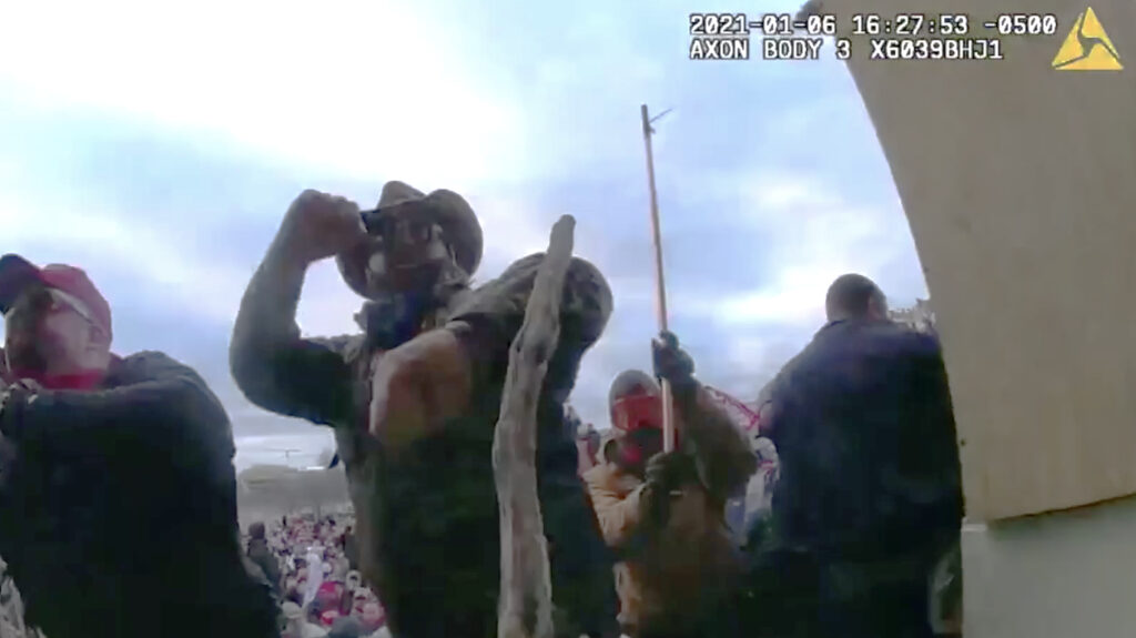 Security video showed Coffee held the crutch over his head for nine seconds before lowering it to waist level and pushing into the police line like a snowplow. He drove the entire line of officers back and stayed pressed against the front line for 20 seconds, according to prosecutors. After he slipped and fell, Coffee “charged” the line a second time, the DOJ argued.