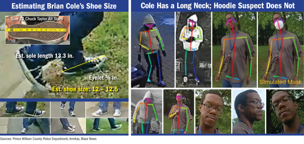 It appears that Cole’s feet are also disproportionately large for someone who stands 5 foot 5 or 5 foot 6 inches tall. The hoodie suspect’s feet, however, appear proportionate to that individual’s 5-foot-7-inch frame.