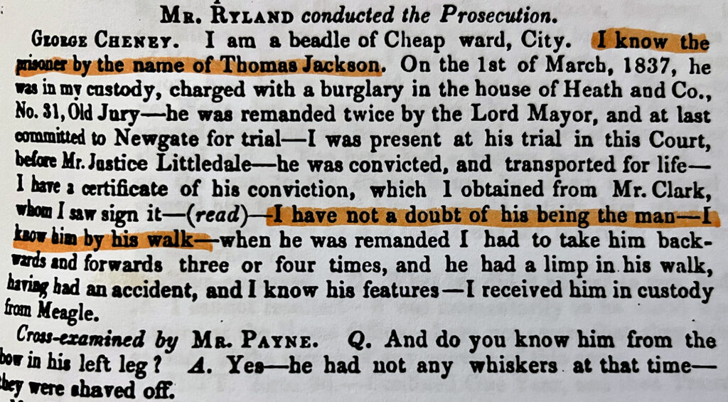 “I have no doubt of his being the man—I know him by his walk,” Cheney said in court testimony. “When he was remanded, I had to take him backwards and forwards three or four times, and he had a limp in his walk, having had an accident, and I know his features.”