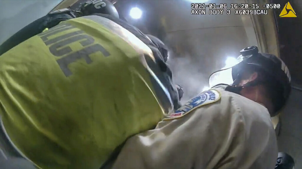 Officer Beaver stood inside the double doors of the Capitol. Her bodycam captured the gas deployment at 4:20 p.m. Some of the gas blew backward into the Capitol.